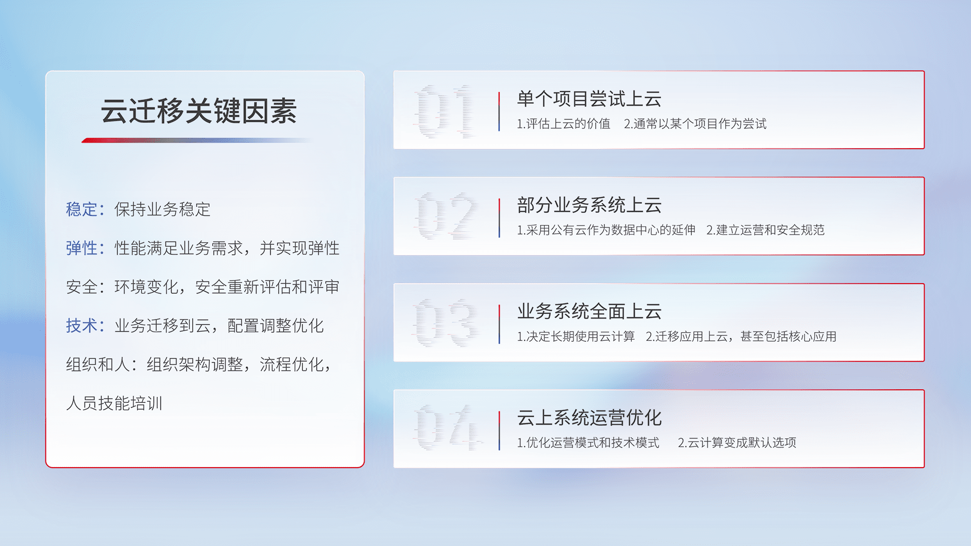 结合实际业务,,从规划设计、、、云平台选型、、、、云原生改造、、、数据迁移、、、集成交付,,,迁移全过程为客户识别最佳上云路径,,,,做好风险识别管理,,设计网络架构、、、、身份权限、、、、安全审计合规、、操作审计、、、、日志审计、、监控告警策略、、、多站点容灾设计等,,对云上基础设施进行整体规划,,,提升IT治理水平,,,以满足弹性、、、、高可用、、、高性能的需求。。。。