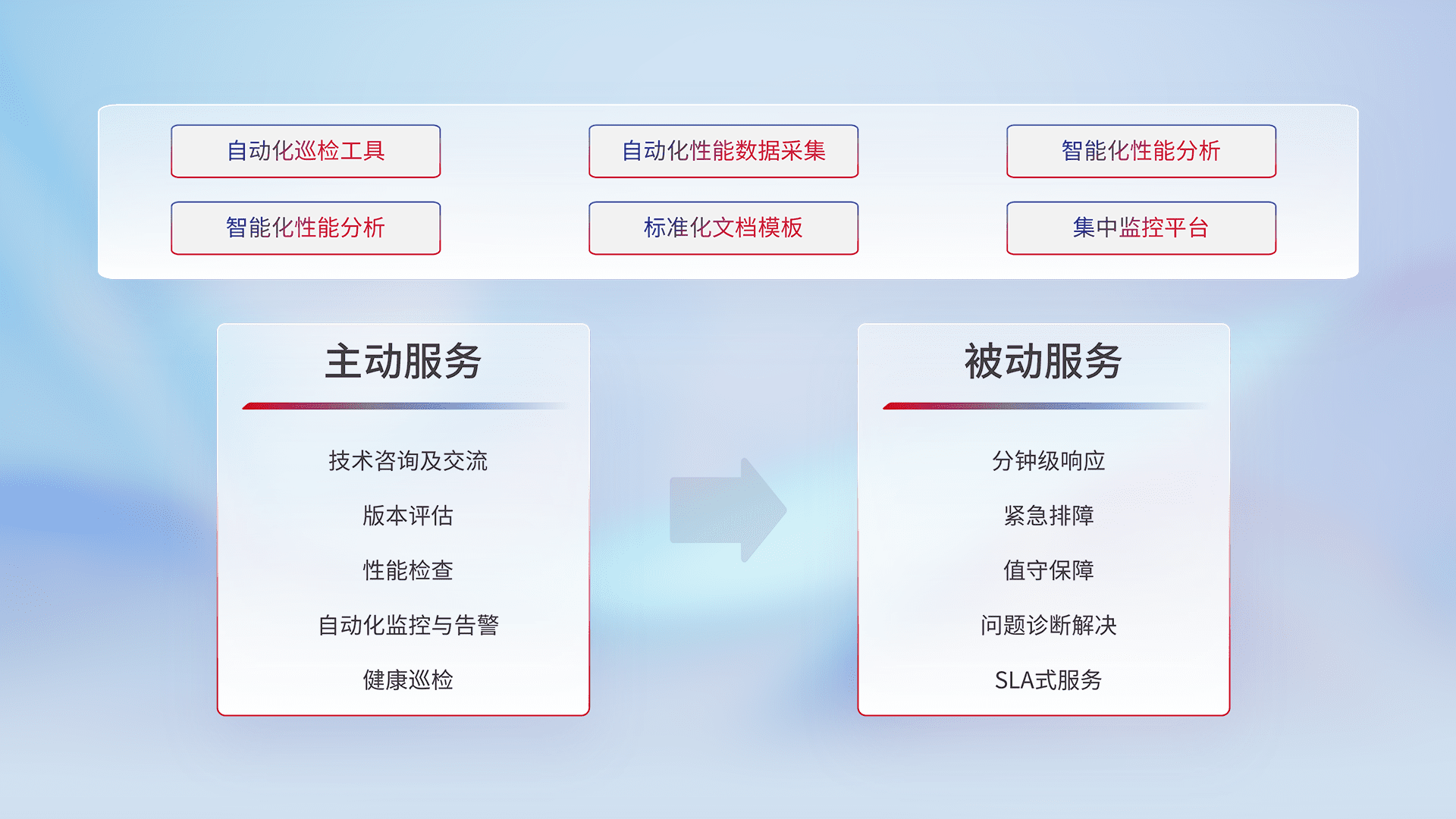 智能化工具和标准化文档,,,,保障服务质量,,,提供主动服务(包含技术咨询、、、版本评估、、、、性能检查、、、自动化监控与告警、、、、健康巡检)和被动服务包含(分钟级响应、、、紧急排障、、、、值守保障、、问题诊断解决、、SLA服务)。。。