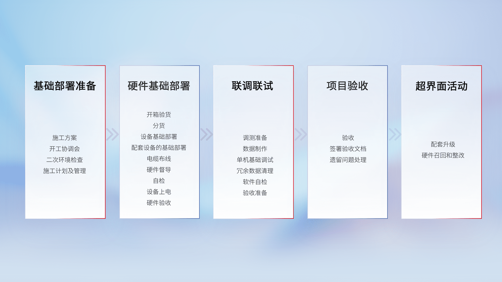 从基础部署准备、、、、硬件基础部署、、联调联试、、项目验收、、越界面活动的全过程可追溯,,,,保证施工质量和进度。。。